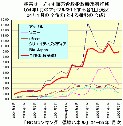 まず、04年1月の携帯オーディオ市場全体の販売台数を1とし、05年9月までの販売台数を指数化。この折れ線を先ほどのグラフに重ねてみた。今年の3月までは、アップルの伸びに主導される形で市場全体も大きく伸びてきた。しかしそれ以降全体の伸びは鈍化、脚踏み状態になっている。最も大きな要因は、第2の選択肢として名乗りをあげたはすのソニーの不調だ。特に8月9月の落ち込みが大きく響き、頭打ちの状況を作り出している。また、市場から撤退する企業が出始めたことも影響していると思われる。