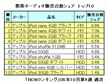 ●早くもトップ10入りの動画iPodとnano、どこまで市場を引っ張るのか?