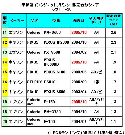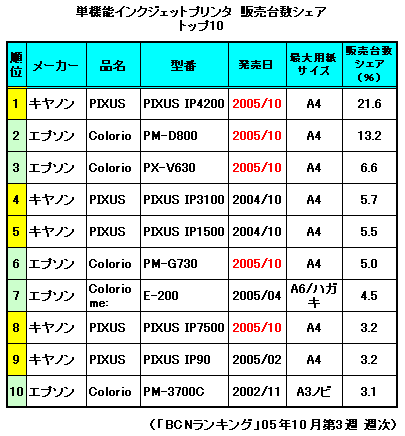 10月第4週(10月17日?23日)の「BCNランキング」の機種別ランキングでは、1位・4位・5位・8位・9位がキヤノンの「PIXUS」シリーズ、2位・3位・6位・7位・10位がエプソン「Colorio」シリーズ。