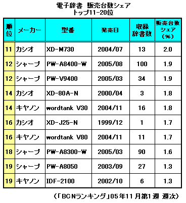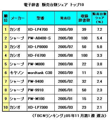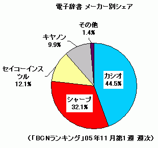 電子辞書全体でのメーカー別シェアは、カシオ計算機が1位で44.5%、2位のシャープが32.1%、3位のセイコーインスツルが12.1%。この上位3社でほぼ9割を占める寡占市場になっている。