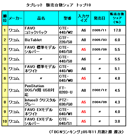 2位以下にも簡単に触れておこう。メーカーシェアがダントツであるため上位10以内はすべてワコム。内訳は、「FAVO」シリーズが7機種、「Intuos 3」が1機種、ビジネス向けモデルが2機種。同じ「FAVO」でも、バンドルソフト数が多い「EXモデル」より「標準モデル」が上位につけている。