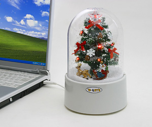 パソコンからUSB経由で電源を供給し、クリスマスソングを鳴らしながらLEDが点滅したり、モーターブロワーの送風によって透明ドーム内に発泡スチロールの雪が舞うクリスマスツリー。音量と雪の吹き量はボリュームで調整できる。