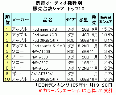 では、この2日間での機種別トップ10を見てみよう。カラーバリエーションを合算して集計したシェアでは、1位から4位までがアップル、5位からソニーが登場し、松下は9位に食い込み、10位に再びアップルという結果になった。iPod nano が相変わらずの強さを見せている一方で、ソニーでは6GB-HDDモデルの「NW-A1000」が、松下では、最上位機種の「SD750V」が今のところの人気モデルとなっている。