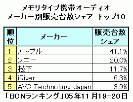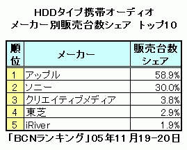HDDタイプでは、アップルはほぼ6割の販売シェアを確保している一方で、ソニーも3割のシェアを獲得。また、メモリタイプでは、トップのアップルが41.1%で、それにソニーが20%で追いかける構図。HDDタイプを投入しなかった松下は、メモリタイプでは3位につけ、販売シェアも11.7%となった。ソニーも松下も新製品の投入で大変健闘してはいる。しかし、いずれも今のところアップルを抜き去るような勢いは感じられない。