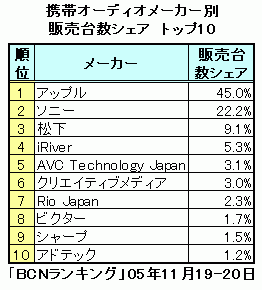 日本の携帯オーディオ市場で、アップルが59.8%と大きな販売シェアを獲得してほぼ1週間が経過した先週末の11月19日、ソニーと松下が新製品を相次いで発売した。これで役者はほぼ揃い、事実上の年末商戦がスタート。これからの商戦を占う上で、重要な最初の週末とも言える19日と20日の2日間、各社の奮闘ぶりはどうだったのか? 「BCNランキング」日次集計による速報値から、その模様をレポートする。