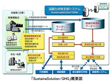 システムは、温暖化対策支援システム「SustainaSolution(サステナソリューション)/GHG」と、企業の事業特性に適した排出量の算定方法や排出削減施策立案を支援する「温暖化対策支援コンサルティングサービス」で構成する。