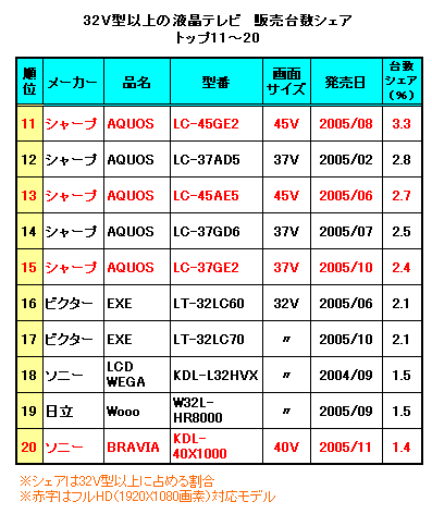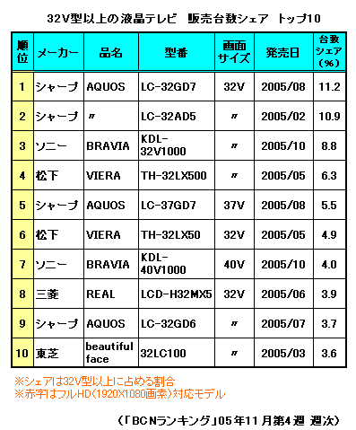 ●液晶のシャープ健在、1位と2位、ともに「液晶AQUOS」