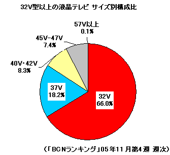 11月第4週で販売された32V型以上の液晶テレビは全部で68モデル。そこから、画面サイズ別のシェアを算出すると、32V型が66.0%、37V型が18.2%で、この2サイズが全体の8割以上を占めている。手頃な大きさと価格というバランスの良さが人気を呼んでいるようだ。