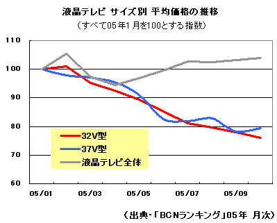 05年1月の平均価格を100とした指数で価格推移を見ると、10月までで、32V型で24%、37V型で20.6%安くなっていることがわかる。37V型の方は少しブレがあるが、32V型は滑らかに下降している。実際、ランキング2位の「LC-32AD5」について平均価格の推移を見ると、2月の発売直後は20万円台後半だったものが、最新週では20万円前後にまで落ちてきている。一方、10インチ台の小型から最大65V型まで含む液晶テレビ全体の平均価格は、ほとんど変化がない。