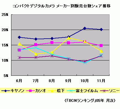 最後にコンデジでのメーカー別販売台数シェア推移を上位5社の動きで見てみよう。やはり目立つのはキヤノンだ。6月以降10%台後半で推移してきたが、10月以降20%台に乗せてきており、安定的に強い。逆に動きが激しいのが松下で、6月時点では15%を超えて2位だったものが、7月で4位に転落。その後9月には一時キヤノンにその差2%まで急接近して2位を獲得。しかし、それをピークに11月では15%割れの水準にまで下落、カシオに抜かれ現在は3位のポジションだ。