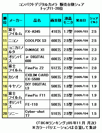 今年の11月に発売されたばかりのソニーの「Cyber-shot T9」は、シェア3.0%で同率8位に食い込んだ。手ブレ補正+被写体ブレ防止の2つのブレ対策機能を採用したとあって、出足は順調だ。また、ほぼ同じタイミングでリリースされた富士フイルムの「FinePIx Z2」はシェア2.0%で15位。これには被写体ブレ防止機能が搭載されている。