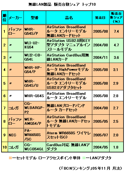 この視点から機種別ランキングを眺めてみると、上位を「AirStation」シリーズが独占しているのも納得がいく。トップの「WHR-G54S/P」は、54Mbpsの無線LANカード1枚がセットになった製品。実売で1万円を切るリーズナブルな価格と簡単設定とが魅力だ。「11g」「11b」の無線LAN規格を同時接続することも可能。ランキングではアクセスポイントやLANアダプタ単体の販売シェアを軽く上回っているということを考えると最初の導入用機器として選ばれているようだ。