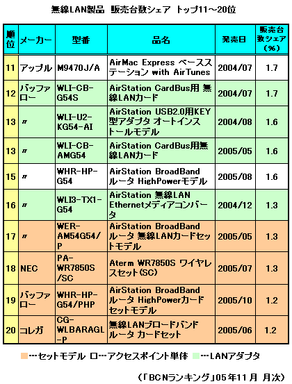 では、実際に売れているモデルをみてみよう。11月の「BCNランキング」から売れ筋トップ20を洗い出してみた。今回は無線LAN機器全体の傾向を見るため、アクセスポイントとカードなどの「セットモデル」、「アクセスポイント」単体、「LANアダプタ」と、関連機器を全部まとめたランキングとした。