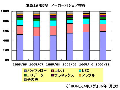 加えて、さまざまな接続環境に合わせたシリーズ機器が豊富にそろっていることも人気の要因。パソコンだけでなく「ニンテンドーDS」や「PSP」などのゲーム機、マルチメディアモニタなど、各種家電機器との対応を広げていることも見逃せない。家庭を無線LAN化する際の有力な簡単設定の規格として、「AirStation」シリーズの「AOSS」が浸透しつつあるといえそうだ。メーカー別の販売台数シェアにもその勢いは表れている。バッファローは常に50%を越える水準で推移してきたが、ここにきて60%台をうかがう水準までシェアを伸ばしてきた。当面この流れは続きそうだ。