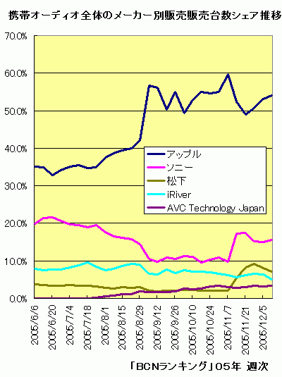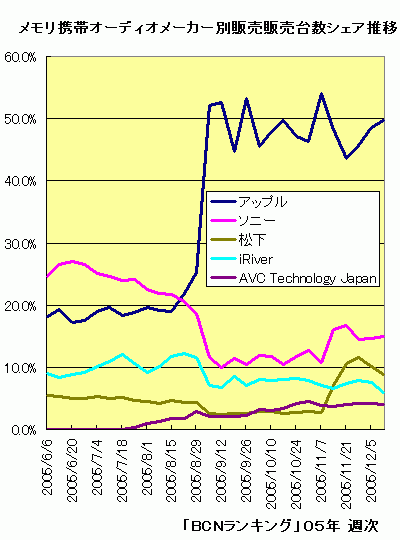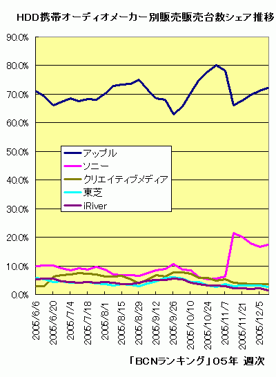 一方ハードディスクタイプのメーカー別シェア推移を見ると、iPod mini(mini)からnanoへと一気にスイッチした9月、それまで70%前後をキープして絶大な強さを見せていたアップルだが、60%前半までシェアを落とした。しかし、その後の第5世代iPodの投入で、落ち込みをカバー。ピーク時にはなんとシェア80%超えを果たした。その後ソニーが新製品2モデルが発売した影響で70%を割り込んだ時期もあったが、すぐに70%台を回復した。
