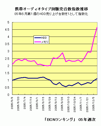 携帯オーディオの販売状況を、メモリタイプとHDDタイプそれぞれで把握するため、6月第1週から12月第3週までの動きをグラフ化した。6月時点でのHDDタイプの全販売台数を1として指数化したものだ。これを見ると、秋以降、メモリタイプの躍進が著しい。