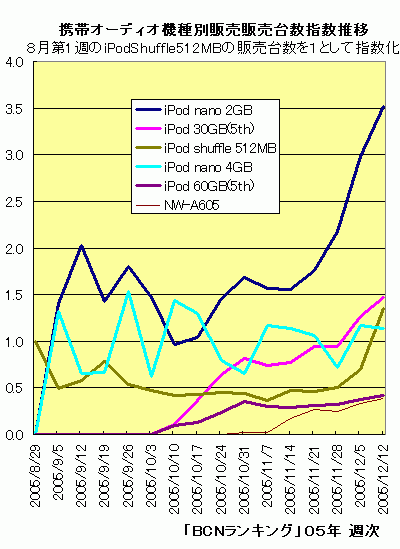 iPod Shuffle(Shuffle)の登場でスタートを切った05年の携帯オーディオ市場。春にソニーがMP3に本格対応したネットウォークマンで「再参入」すると、メモリタイプでShuffleを追い抜くという離れ業を披露。しかしiPod nano(nano)の発売でアップルが首位を奪還……。携帯オーディオ今年の主役は、メモリタイプだった、といえそうだ。そこで、大きく躍進したメモリタイプの携帯オーディオについてまとめながら、年末商戦も終盤にさしかかった12月第3週の「BCNランキング」で売れ筋の20モデル