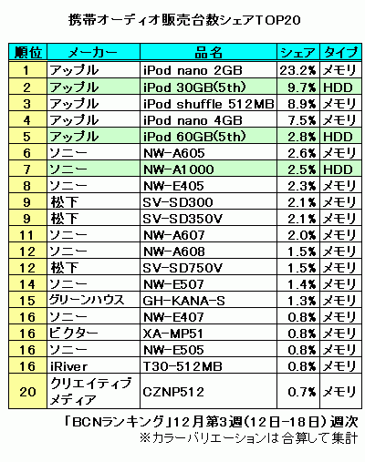 iPod Shuffle(Shuffle)の登場でスタートを切った05年の携帯オーディオ市場。春にソニーがMP3に本格対応したネットウォークマンで「再参入」すると、メモリタイプでShuffleを追い抜くという離れ業を披露。しかしiPod nano(nano)の発売でアップルが首位を奪還……。携帯オーディオ今年の主役は、メモリタイプだった、といえそうだ。そこで、大きく躍進したメモリタイプの携帯オーディオについてまとめながら、年末商戦も終盤にさしかかった12月第3週の「BCNランキング」で売れ筋の20モデルをチェックする。