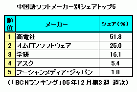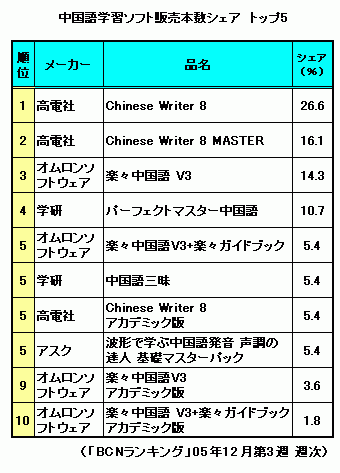 シェア14.3%で3位となったのがオムロンソフトウェアの「楽々中国語 V3」。中国語の上に声調付きピンインやカタカナの「読み」を自動的に付加したり、単語の上にマウスを置くだけで、単語の読みを音声で出力する機能を持つ。携帯電話にもインストールして使用できるため、通勤や通学をはじめ外でも手軽に学習ができる。5位にはPCで中国語活用するためのガイドブック付き版がランクインしている、●メーカー別では高電社がトップで50%超のシェアを獲得