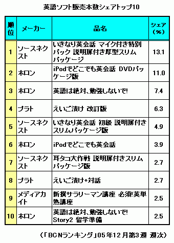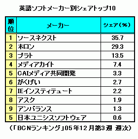 最後に「英語」ソフトのメーカー別のシェアをみてみよう。1位になったのはシェア36.5%のソースネクスト。充実したソフトのラインアップと、なんといっても価格の安さが売れている理由だろう。20.1%のシェアで2位となったホロンは、ソフト別ランキング2位の「iPodでどこでも英会話」やランキング4位「英語は絶対、勉強しないで!」の販売が好調だ。