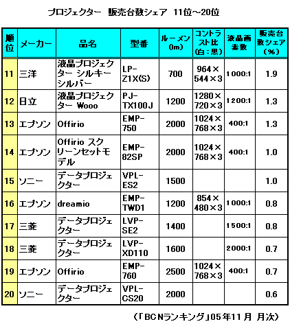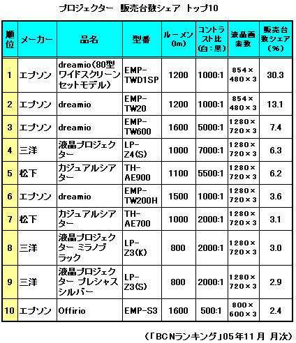 3位から9位までは「EMP-TW600」と同じ高画素タイプが占めている。4位で健闘しているサンヨーの「LP-Z4(S)」は、同社の液晶プロジェクターのフラッグシップ機で、12ビットの映像処理ICを搭載し、上下最大3画面分、左右最大2画面分も動かせるレンズシフト機能や、7000:1という業界最大のコントラスト比を誇る。