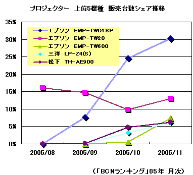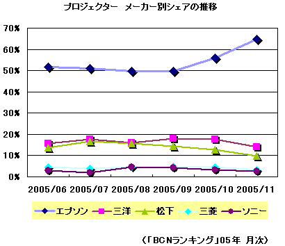 最後に、今年6月から11月までのメーカー別販売台数シェアの推移を、上位5社の動きで見てみよう。やはりエプソンが首位を独走している。2位以下との差も圧倒的。その2位をサンヨーと松下が争う形だ。