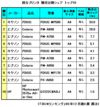 3位以下9位まではキヤノン対エプソンのまさに二人舞台。この2社で熾烈なデッドヒートが繰り広げられている。上位にきているのは、6位の「PM-A700」を除き、いずれも05年10月発売の新しいモデルだが、キヤノン・エプソンともに、一番手頃なエントリーモデル「PIXUS MP170」(8位)、「PPX-A650」(9位)より、価格の高い上位モデルが売れているのが興味深い。複合プリンタでは価格もさることながら、それなりの高機能、高画質が求められているようだ。また、買い替えのユーザーが年々増加し、要求されるスペックが上がってきている、という背景も無視できない。