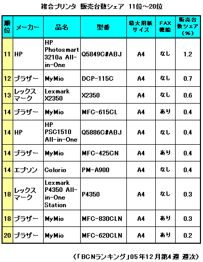 10位・11位には、日本HP(ヒューレット・パッカード)の2モデルがランクインした。どちらも、6色独立インクタンクや2.5型液晶など、1位・2位とスペック的には遜色のないものの下位にとどまっている。世界的に高いシェアをもつ同社だが、国内では存在感が薄い。しかし、11月に移転オープンしたある家電量販店では、移転前より展示コーナーを拡大し、パンフレットを手配りしたり、店舗限定プレゼントキャンペーンを実施するなど、強力なプロモーションを展開していた。こうした知名度アップの試みが成功するか、今後の動向に注目したい。