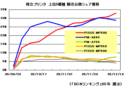 実売価格は、「PIXUS MP500」より数千円高い2万円台後半から3万円程前後。このわずかな価格の違いが、11月に入って「PIXUS MP500」の逆転を許してしまった要因のひとつと思われる。12月第3週では、1位に1.2ポイント差まで迫ったが、12月第4週では再び4.2ポイントまで差が拡大している。