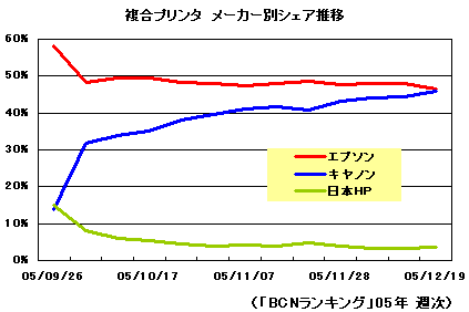 メーカー別シェアではエプソンが48.6%で1位、続くキヤノンが45.1%という結果になった。9月以降のメーカー別シェア推移を見ると、それまで圧倒的大差でリードしてたエプソンだったが、10月の新モデル発売でキヤノンがジャンプアップ。以降、両社の差はどんどん接近している。現段階では僅差で軍配はエプソン。しかし、機種別ランキング1位のキヤノン「PIXUS MP500」が着々とシェアを伸ばし、ここにきてさらに加速がついていることを考えると微妙な状況だ。このままエプソンが首位を死守できるか、キヤノンにその座を明け渡すことになるのか、06年1月、年末年始商戦の最終結果で明らかになるだろう。