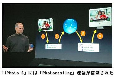 続いてジョブズCEOが語ったのは、Appleオリジナルのアプリケーションソフトについて。その中でも注目は、やはり「iLife」だろう。「iPhoto」「iMovie HD」「iDVD」「GarageBand」「iTunes」で構成される「ilife」は、Appleの提唱する「デジタル・ハブ」を具現化するソフト群である。その「iLife」が'06へとアップグレードした。「iPhoto 6」では、新たに「Photocasting」という機能をサポート。これはいわば、Podcastの写真版。AppleのWebサービスである「.Mac」を介して、写真を公開したり、共有したりすることができるようになった。また、「GarageBand 3」を使うと、Podcast用のコンテンツを実に簡単に作成することができる。「iMovie HD」では、Appleがデザインしたモーションテーマが追加され、まるでハリウッド映画のような自作ムービーをつくることができる。しかも、ビデオPodcastとして書き出すこともできるようになった。