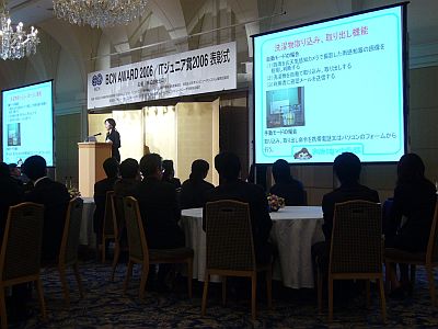 「ITジュニア賞」は、次世代のIT技術立国を担う若い世代にモノづくりの情熱を伝えることを目的として今年創設。「BCN AWARD」に集った日本を代表するトップメーカーの関係者を前に、優秀校の表彰と受賞校による作品のプレゼンテーションを行うもの。244人の参加者を集めた会場が、ITのプロの激励によって、技術にかける情熱が若者たちに引き継がれる場になればとの願いもこめられている。第1回目となる「ITジュニア賞2006」では、和歌山県立田辺工業高等学校、鳥羽商船高等専門学校、宇部工業高等専門学校、津山工業高等専門学校の4校が受賞した。