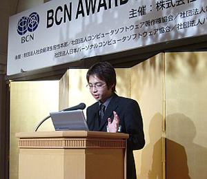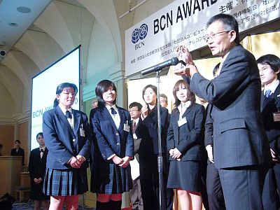 表彰式でBCNの奥田社長は「この場で若い人たちに、夢をライブで語ってもらいたい。今日お渡しするのは栄光のトロフィーのジュニア版。何年か後、大きな本物のトロフィー BCN AWARD を取りに来てほしい。そして今日はIT業界のトップに作品をどんどん売り込んでほしい」と激励した。