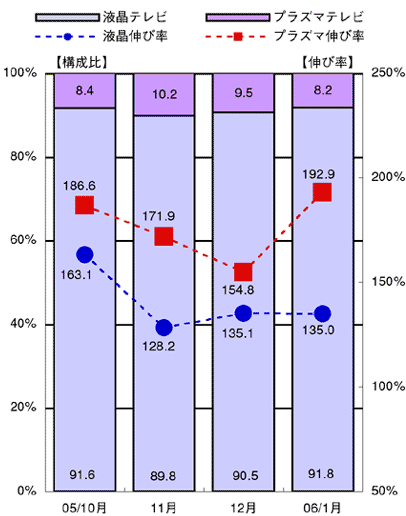 06年1月のプラズマテレビの伸び率は、台数ベースで前年同月比で192.9%、液晶テレビは135%とそれぞれ高い伸び率を記録した。