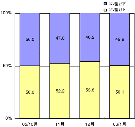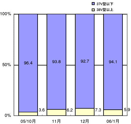 しかし、大型サイズの液晶テレビが本格的に市場に投入し始めていることを背景に、38V型サイズ以上の液晶テレビの構成比も05年10月の3.6%から年末の需要期には11月は6.2%、12月には7.3%まで上昇。06年1月には5.9%と下がったものの、大型サイズで液晶が少しずつではあるが勢力を増す兆候が現れている。