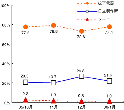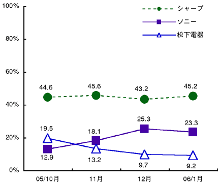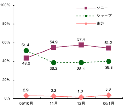 液晶テレビではソニーの躍進が注目される。「37V型以下」では05年11月に松下を抜き18.1%でシェア2位を確保した。その後もシェアを伸ばし、06年1月ではシェア23.3%までになっている。また、「38V型以上」でも11月にシャープを追い抜き54.9%と市場の半数を超えるシェアでトップに踊り出た。12月以降も50%台をキープし、3か月連続でトップメーカーに君臨している。