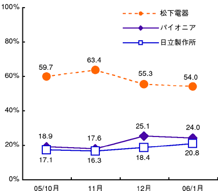 プラズマテレビでは「37V型以下」「38V型以上」ともに松下が圧倒的なシェアを獲得している。特に「37V型以下」では06年1月ではシェアの7割を握りほぼ寡占状態にある。「38V型以上」でも11月に記録した6割から下げたものの依然として50%台を維持し、1月でも54%と2位のパイオニアのほぼ倍のシェアとなっている。(図表:6、7)