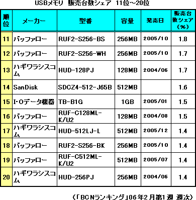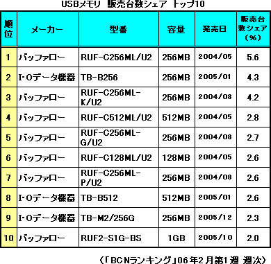 それでは、売れ筋のUSBメモリを見ていこう。「BCNランキング」2月第1週(06年1月30日-06年2月5日)では、バッファローの「RUF-C256ML/U2」が1位を獲得した。この1週間でPOSレジを通過したUSBメモリはなんと400製品以上。数あるUSBメモリを抑えて唯一5%を超えるシェアを獲得し、トップに輝いた。