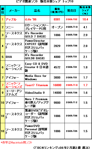 ここで「ビデオ関連ソフト」の守備範囲について簡単に説明しておこう。「BCNランキング」では、店頭でパッケージ販売されているパソコンソフトを、OS、セキュリティソフト、携帯電話ソフトなど、機能別にジャンルを分けて集計しているが、動画編集ソフト、DVD再生ソフト、DVD作成ソフト、アニメーション作成ソフトなど、ビデオや映像に関わる機能が含まれているソフトを「ビデオ関連ソフト」と分類している。「iLife」は、動画編集の「iMovie」やDVD作成の「iDVD」を含むことから、「ビデオ関連ソフト」として分類されている。