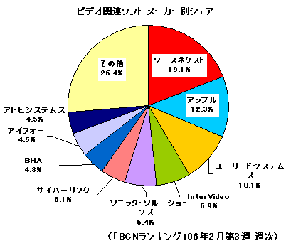 05年1年間を通じての「ビデオ関連ソフト」ナンバー1メーカーは、パソコンソフトのコモディティ(日用品)化を標榜し、1980円という低価格製品中心の戦略を推し進めるソースネクスト。続いて、ユーリードシステムズ、ライブドアの順だった。シェアはソースネクストが全体の2割近い19.3%、2位のユーリードシステムズでも11.6%、3位以下ですでに10%を切り、多くのメーカーが並んでいる状態だ。