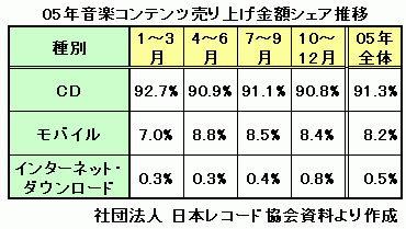 日本レコード協会が発表した会員41社の売上実績によると、05年1年間の有料音楽配信の売り上げは、94.3%と大半が「着うた」など携帯電話向けの「モバイル」で約323億4000万円だった。一方「iTunes Music Store(iTMS)」などのインターネット・ダウンロード向けは18億5000万円で5.4%となり、これらを合わせた有料音楽配信全体で342億円だった。一方、同協会が集計している05年音楽CDの生産実績は3598億円。これらを合わせると、DVDなどを除く音楽コンテンツ市場は年間で3940億円という結果となった。