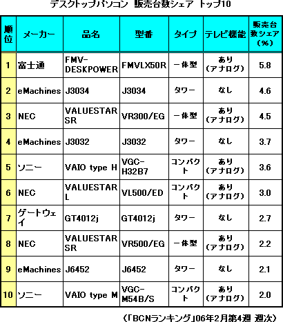 一方、先週1位だったeMachines「J3034」は、シェアを下げ、2位に後退した。eMachinesは、米ゲートウェイが展開する低価格PCブランド。06年春モデルでは、インテル Celeron D プロセッサ 351(3.20Ghz)、メモリ512MB、HDD 200GBのPC本体のみで6万円程度という「J3034」が、価格とスペックのバランスの良さで頭ひとつ飛び出ている。このほかの春モデルも、上位20位内に多くランクインしており、AV機能を強化した国内メーカー製パソコンとは違う、もう一つのトレンドを形成しつつある。