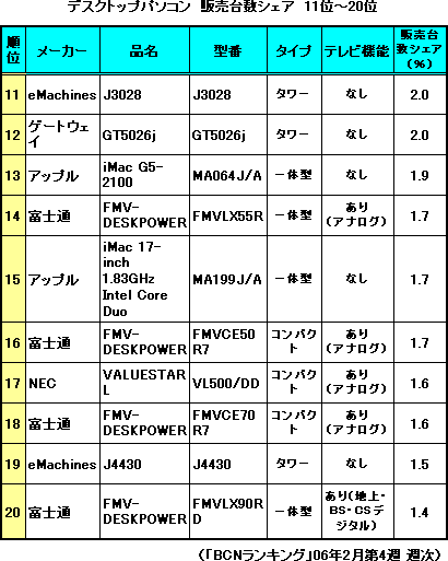 また、06年に入ってインテル製CPUへの移行を開始したMacは、CPUに従来のPowerPC G5を搭載した05年10月発売の「iMac」が13位に入ったものの、Core Duoを搭載した1月11日発売の新しい「iMac」は、それより低い15位にとどまっている。実は、新しいiMacが、旧iMac G5を上回ったのは、1月第3週とその翌週のみ。ソフトの対応の遅れなどの関係で、以前のiMac G5も求めるユーザーもまだ多いようで、2つのiMacに売れ行きが分かれる、静かなスタートとなっている。*「BCNランキング」は、全国のパソコン専門店や家電量販店など18社・2200を超える店舗からPOSデータを日次で収集・集計しているPOSデータベースです。これは日本の店頭市場の約4割をカバーする規模で、パソコン本体からデジタル家電まで115品目を対象としています。