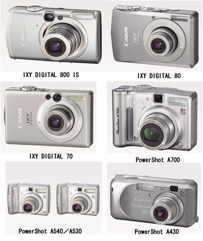 今回発表した「IXY DIGITAL」シリーズは、同シリーズ初のレンズシフト式手ブレ補正機構を採用した光学4倍ズーム搭載の上位機種「IXY DIGITAL 800IS」、同社のデジカメ初となる高精細・広視野角の大画面3.0型液晶モニタを搭載した「同 80」、現行モデルのNo.1人気機種「同 60」の後継となる「同 70」の計3機種。「PowerShot」シリーズは、光学6倍ズームレンズを搭載した「同 A700」シリーズなど、計4機種。