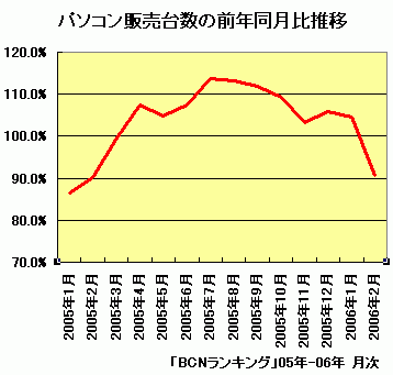 「BCNランキング」によるパソコンの販売台数は、前年同月比で05年4月以降前年を上回る勢いで好調に推移していたが、06年2月に入り前年を割り込みはじめており、Vistaの投入が待ち望まれている。国内PCメーカーも「Vista特需」を見込んで今春から、Vista仕様のPCを発売するものと見られているが、マイクロソフトでは「Vistaの仕様に沿ったマシンであればリリースできるため、そうした製品をいつ発売するかはPCメーカーの判断」(同)として、PC販売市場への影響について明言を避けた。