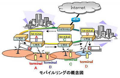 「モバイルリング」は都市部など、携帯電話の利用が100万台以上とユーザーが密集する地域を対象に、エリア内で端末間同士が大量のトラフィック交換を行えるようにするネットワーク。端末の位置管理とパケット転送の制御する「LMA」と呼ばれる装置を使い、ギガビットの高速光回線へリング状に装置を複数接続。それぞれの装置に無線基地局を収容してネットワークを構築する。