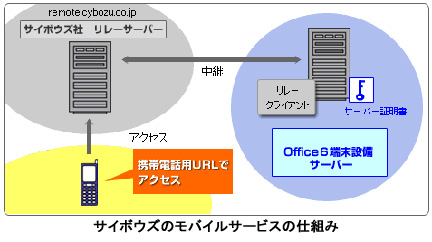 サイボウズは3月23日、ウィルコム(八剱洋一郎社長)と業務提携し、PHSを使った法人向けモバイルグループウェアサービスを始めると発表した。3月23日から試験サービスを行い、06年末をめどに正式サービスを開始する。試験サービスはサイボウズが選んだ同社のグループウェア利用企業10-20社、最大400ユーザーを対象に実施。三洋電機製か日本無線製のウィルコムPHS端末から専用のウェブサイトにアクセスし、サイボウズのサーバー経由で利用企業のグループウェア「サイボウズ Office」を利用できるようにするもの。PHSを使って、スケジュールや社内掲示板などの確認や追加、変更をPCと同じように利用できる。サイボウズのサーバーと利用企業のサーバー間の通信には暗号プロトコル「SSL」を採用してセキュリティを確保。端末の購入や通信費などはすべてサイボウズが負担する。