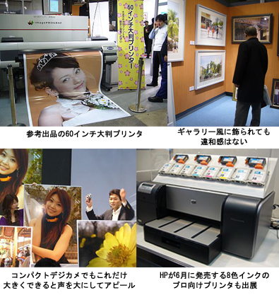 その大判印刷を可能としたのはプリンタ。日本ヒューレットパッカードは顔料系フォトインク“Vivera(ビベラ)”を採用したプロフォトグラファーおよびハイアマチュア向けのA3対応インクジェットプリンタ「Photosmart Pro B9180」を展示。こちらは6月中旬に発売予定だ。A3サイズのフチなし印刷もできる。さらに紙だけではなく1.5mmまでの厚さのキャンバスにもプリントでき、作品の保存も可能となった。