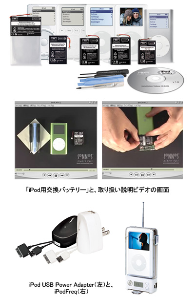 交換バッテリーは、対応するiPodごとに計5種類を用意した。とくに初代・第2世代iPod用では、純正バッテリーより最大75%駆動時間がアップするという。価格は、初代・第2世代用の「BAT-1G2G」が5125円、第3世代用の「BAT-3G」、第4世代(モノクロ液晶搭載モデル)用の「BAT-4G」、iPod photoなどカラーディスプレイを搭載した第4世代iPod用の「BAT-4GC」、iPod mini用「BAT-MINI」はともに4074円。