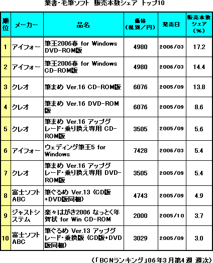 ●特典満載の「筆王2006春」が1位を獲得 ウェディング版も6位に